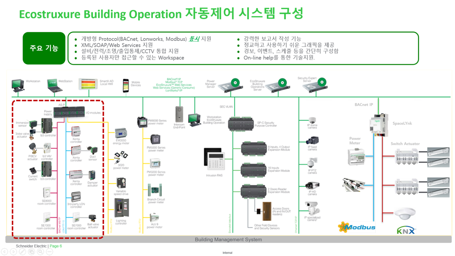 Ecostruxure Building Operation System은 스마트 빌딩을 위한 통합관리 플랫폼으로, 기계설비, 전력, 조명, 보안, 에너지까지 모든 시스템을 하나로 연결하고 최적화합니다. 개방형 프로토콜 기반의 유연한 확장성과 직관적인 운영 환경을 통해, 에너지 절감은 물론 건물 운영의 효율성을 극대화하며, 미래지향적인 스마트 빌딩 구축을 위한 최적의 솔루션을 제공합니다.