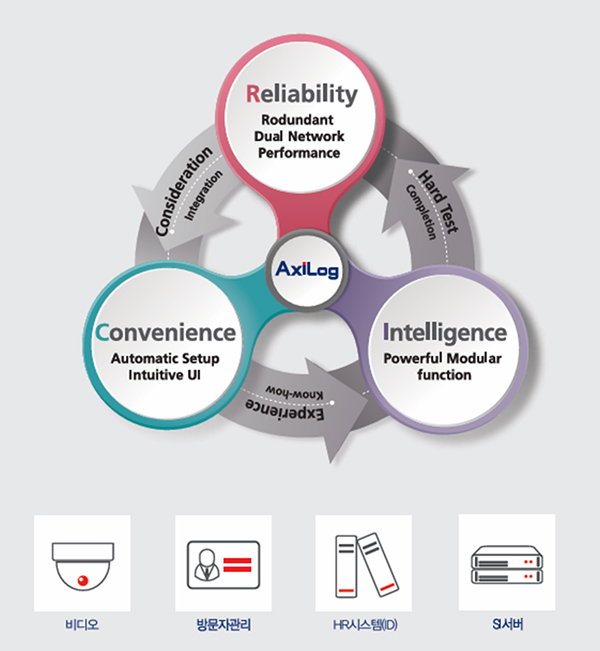 AxiLog(엑시로그)는 효율성과 경제성을 혁신적으로 개선한 고성능 보안솔루션으로 개방형 표준 소프트웨어와 IP기 반의 All Access Control System 입니다. Rack Type 과 Compact Slot Type의 하드웨어 구성은 공간효율과 쉬운설치, 간편한 유지보수를 제공함으로써 탁월한 경제적 이득이 있으며 제어장치의 차별화된 디자인은 장소별/규모별 유연한 구성이 가능해 졌습니다. 또한, 암호화 이중화 통신구조(Redundant)간 Local Bus 동적암호화 통신방식을 적용하여 보다 안정되고 강화된 보안을 제공합니다.